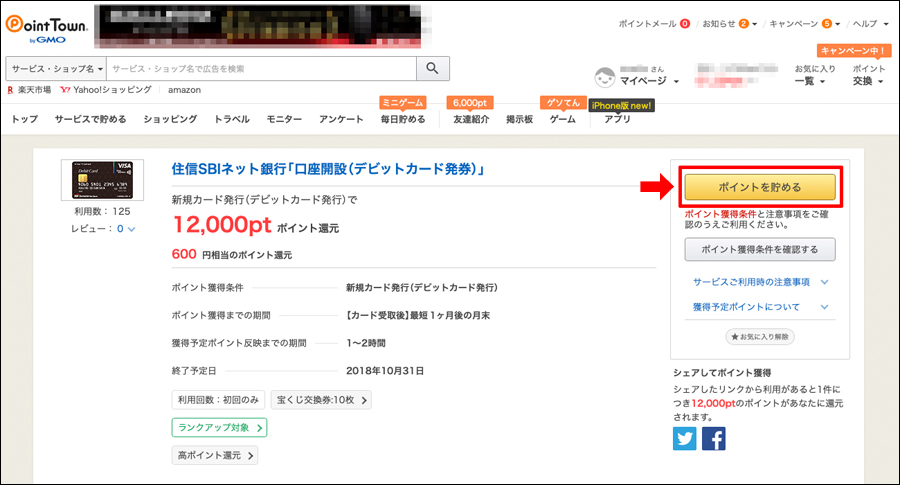 ポイントタウンの「住信SBIネット銀行口座開設デビットカード発行」ページの「ポイントを貯める」をクリック!