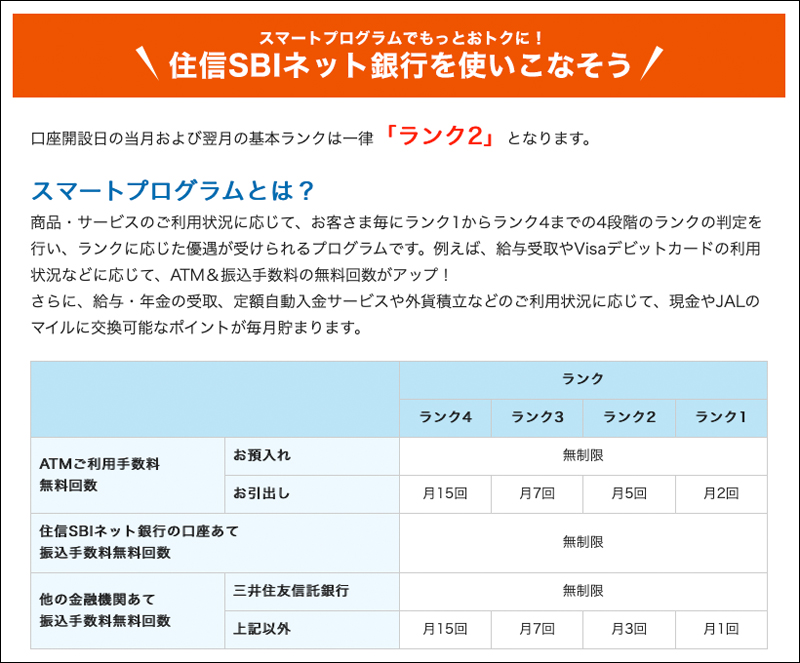 ランク1でもATM引き出し手数料無料回数月2回、他金融機関宛の振込手数料無料回数月1回なので考えて使用したら手数料が抑えられますね♪