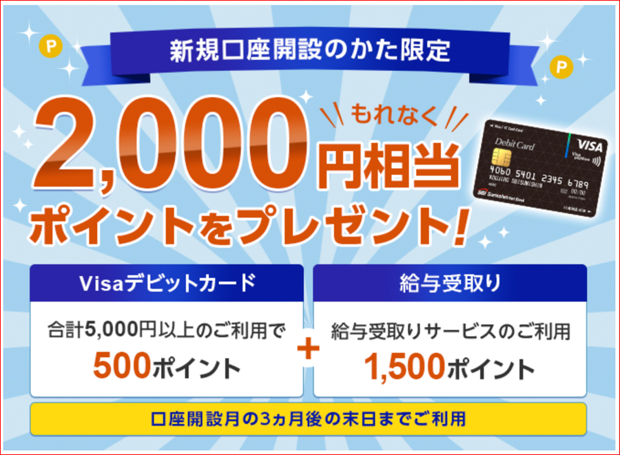 口座開設月の3ヶ月後の末日までにVISAデビットカード5.000円以上の利用で500ポイント、給与受け取りの利用で1500ポイントです。