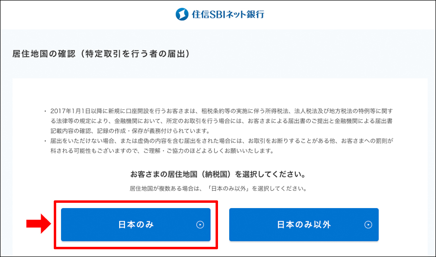 お客様の住居地国(納税国)を訪ねられるので私は日本のみなので「日本のみ」をクリック!