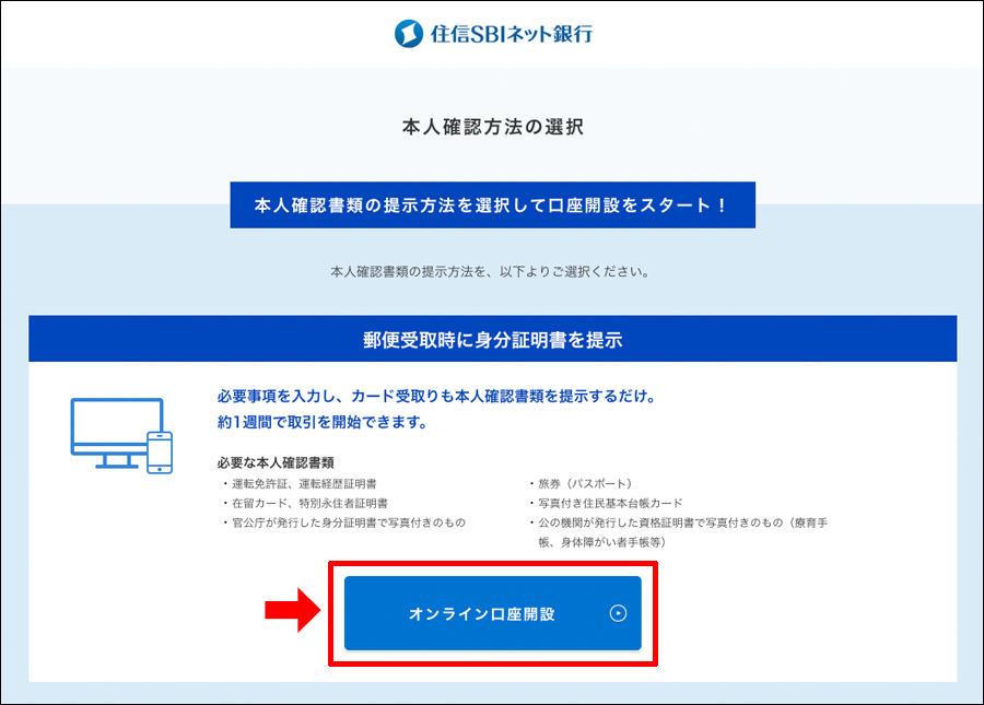 本人確認方法の選択の詳細お知らせページが表示されました、内容を読んでオンラインで口座開設可能なので「オンライン口座開設」をクリック!