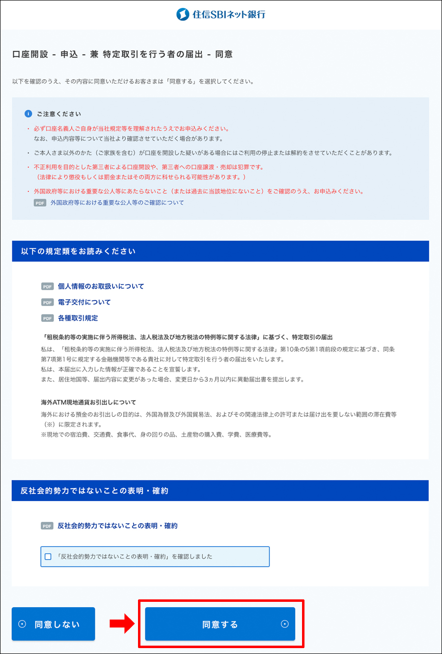 新規口座開設に関して規定などをよく読んで反社会的勢力ではない事の表明、確約を読みチェックを入れて「同意する」をクリック!