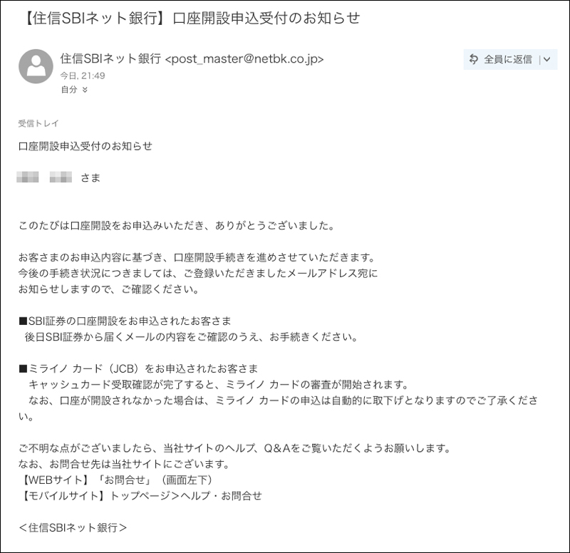 登録メールアドレスに「口座開設申し込みのお知らせ」が届いていました。