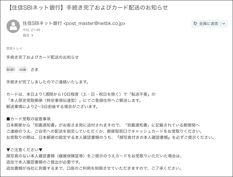 これで無事終了「住信SBIネット銀行口座開設デビットカード発行」新規口座開設が出来ました♪