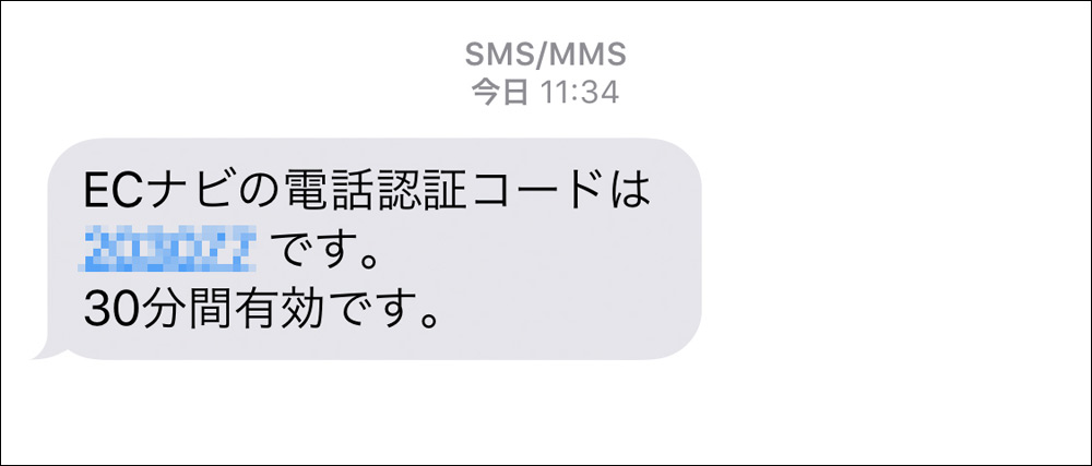 ECナビに予め登録しておいたSMSに6桁の電話認証コードが届きます。