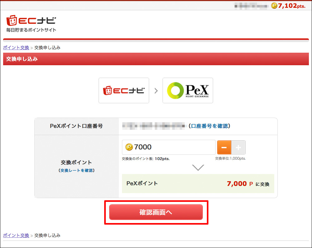 ECナビポイントが7000ptsになったのでPeXポイントに交換したのでその様子をお届けします。