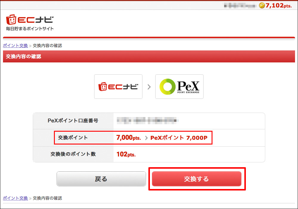 ポイント交換画面が表示されるのでいつもの交換先のPeXポイントの